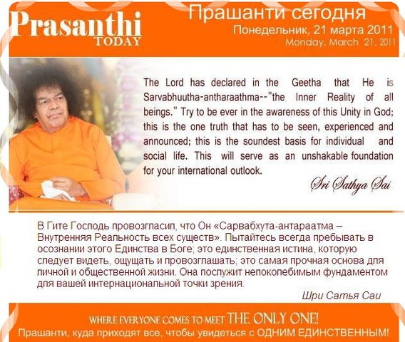 mahaprema Опубликовано 20 марта, 2012 Опубликовано 20 марта, 2012 Из новостей того дня: 20 марта 2011, воскресенье Усиливающийся темп бхаджанов, дополненный обострением чувств, ознаменовал в этот вечер появление Бхагавана в 19:25 в Его Обители Высшего Покоя Прашанти Нилаям. И когда Он двигался, показывая Своё сострадательное лицо, изливая любовь повсюду, тысячи, наполнившие Саи Кульвант холл, пришли в восторг, изливая радость, бившую изнутри. Множество людей собралось в этот выходной день, и в атмосфере очень сильно ощущалось праздничное настроение, связанное с праздником холи, особенно в отдельной группе мужчин и женщин из штата Бихар. По мере того как Его машина продвигалась медленно, на женской стороне многие вставали в полный рост. Его машина почти ползла, часто останавливалась, и Бхагаван отвечал на многие мольбы. Неистовство преданных усилилось, когда Он начал совершать второй круг. Многие, сидевшие сзади, поднялись на ноги, чтобы уловить драгоценный образ, и когда они вскрикивали, звук тонул в громком пении бхаджанов. Остановившись около блока Вед, Бхагаван благословил общением одного из студентов, прошептав поздравления, бхаджаны на некоторое время затихли. Во время кругов даршана, продолжавшихся 25 минут, Его руки разбрасывали пакетики вибхути. Два круга даршана завершились, и вскоре Бхагаван поднялся на сцену. Именинники из числа студентов и учеников были готовы, и Бхагаван подозвал их. Он благословил их всех, включая малышей начальной школы, осыпав их жёлтыми зёрнами риса. Несколько ребят держали поделки, приготовленные как подношение Бхагавану. Бхагаван благословил их, уделив время их просмотру. Была видна Его материнская любовь, когда Он одобрительно потрепал их по щекам – знак Его все покоряющей любви к Своим детям. Одному мальчику, который нарисовал красочную картинку, изображавшую Уважаемую Мать Ишварамму, Бхагаван сделал несколько ценных замечаний о рисунке, а затем благословил его жестом «чала сантошам – очень счастлив». Бхаджаны продолжались, Бхагаван сидел на сцене. Время от времени Он дважды окроплял окружающих жёлтыми зёрнами риса, оставшимися у Него на коленях. Пришло время раздачи прасада. Когда ребята подошли к Бхагавану со сладостями ладу, прося благословения, Он взял несколько штук, одну за другой, лично давая прасад некоторым из высокопоставленных лиц. В 20:20 Бхагаван подал знак выполнить Мангала арати. Благословив собрание, выразив Своё удовлетворение прекрасной улыбкой, расцветшей на Его лице, Бхагаван покинул сцену и в 20:25 удалился в Яджур мандир. Саи Кульвант холл с восторгом вспоминал золотые моменты вечера, в восторге были тысячи, наполнявшие зал благословенного «Божественного Театра», где Бог решил «двигаться», даруя Свои наивысшие благословения. https://www.sairam.ru/topic/9157/page__view__findpost__p__94849