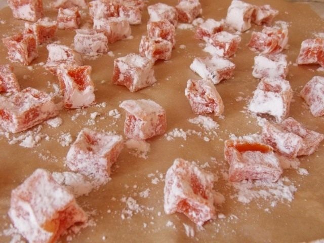 Проверяем на вид и на ощупь: готовые цукаты упругие, в серединке мягкие, снаружи ещё самую чуточку липкие. Не надо высушивать их слишком сильно, иначе пудра не станет держаться.