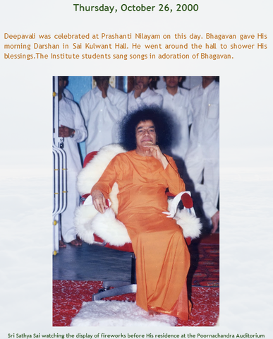 mahaprema Опубликовано 31 октября, 2013 Автор Опубликовано 31 октября, 2013 Празднование Дипавали 26 октября 2000 г., Свами наблюдает за фейерверками На шпильках 1