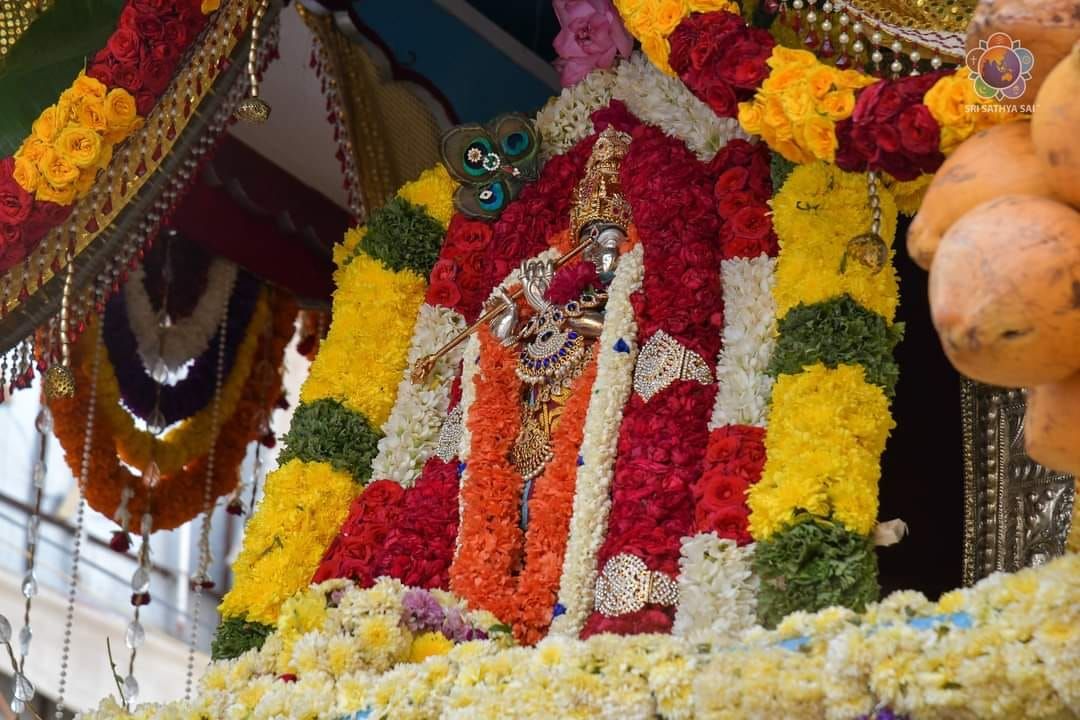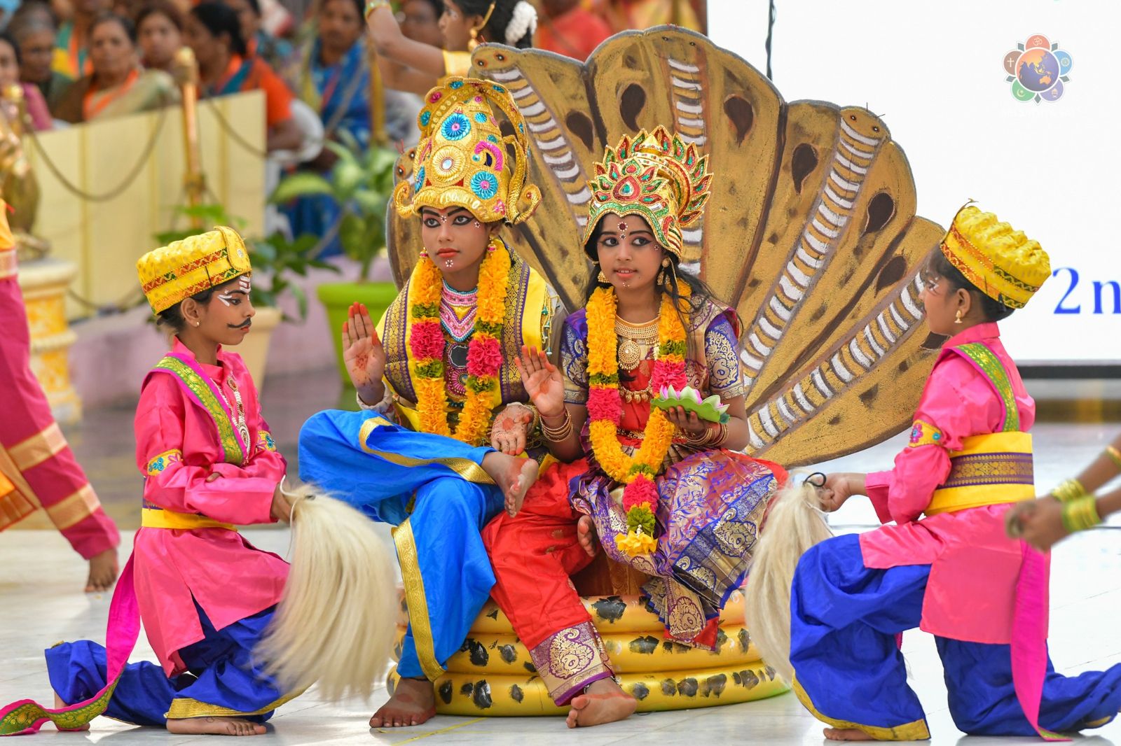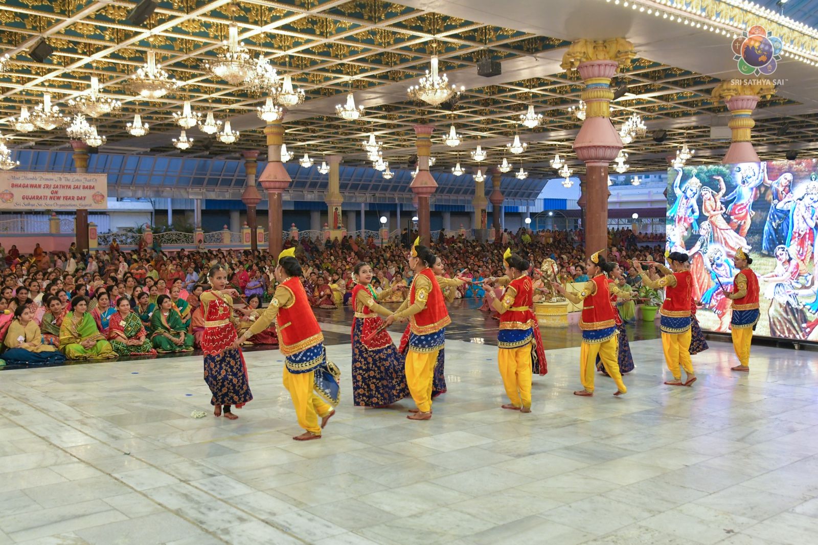 Сегодня вечером в рамках празднования золотого юбилея Шри Сатья Саи Сева Самити города Бхадравати, ученики школ Шри Сатья Саи, Бхадравати, Карнатака, представили букет культурных и традиционных танцев, посвящённых вначале форме Бога Кришне: