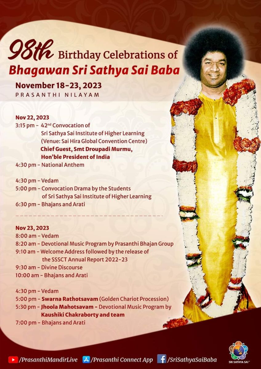 По Божественному благословению основателя и канцлера, Бхагавана Шри Сатья Саи Бабы, 42-й созыв Института высшего образования Шри Сатья Саи (SSSIHL) состоится в новом Всемирном Конференц-центре Саи Хира, в Прашанти Нилаям, 22 ноября 2023 года в 15:20 по восточному стандартному времени*.