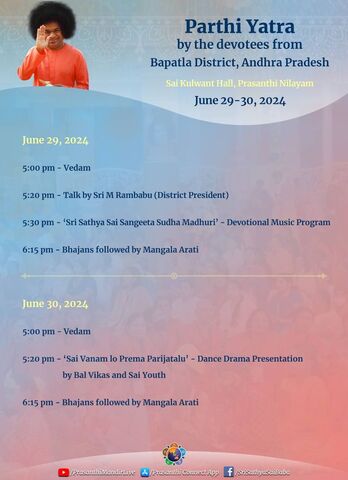 marianna Опубликовано 7 июня, 2024 Автор Опубликовано 7 июня, 2024 8-9 июня 2024 г. Парти Ятра преданных из района Анантапураму Ниже расписание программ в Саи Кулвант Холле на эти дни Парти Ятры: Источник