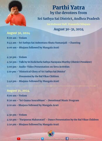 marianna Опубликовано 30 августа, 2024 Автор Опубликовано 30 августа, 2024 30-31 августа 2024 г. Парти Ятра преданных из округа Шри Сатья Саи, штат Андхра Прадеш Ниже расписание программ их выступлений в Саи Кулвант Холле на эти дни: Источник