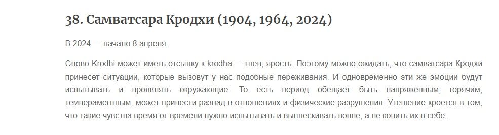 marianna Опубликовано 6 апреля, 2024 Опубликовано 6 апреля, 2024 В 31.10.2007 в 13:56, Narayana сказал: Имена этих 60 лет цикла Самватсары: Кродхи -- Krodhi (2024) 8 апреля 2024 года начнётся новый год по телужскому календарю, и как видно из вышеприведённой цитаты, он имеет название "Кродхи". О Самватсаре "Кродхи" (1904, 1964, 2024) с одного сайта Джйотиш (ZvezdaVed.ru), ссылка на этот сайт здесь выше уже тоже есть: ========== так что год, видимо, будет довольно напряжённым, но это как проверка на прочность всем преданным