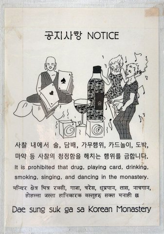 Что меня восхитило - в монастыре полный коммунизм. Приехавшие обращаются к дежурному (в домике слева, где красная машинка), он выдает ключи от свободных комнат - и всё. Единственное условие - раздельное проживание мужчин и женщин. Никакой оплаты!!! Завтрак-обед-ужин по расписанию, в столовой в противоположном крыле, представляет из себя шведский стол из вегетарианских блюд корейской кухни, довольно острых, в режиме самообслуживания: на входе взял тарелку и палочки, выбрал еду, покушал, помыл за собой посуду(!), положил тарелки на место.