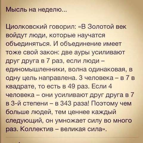 Purusha Опубликовано 21 октября, 2015 Автор Опубликовано 21 октября, 2015 НАША СИЛА - В ЕДИНСТВЕ В Единстве скрыта невообразимая Сила! Когда мы совместно и синхронно поем САМАСТА ЛОКА СУКХИНО БХАВАНТУ, наша энергия, возможно, достигает самых отдаленных уголков Вселенной; эта Сила Любви проникает во все миры, - в каждое существо, наполняя каждого теплом соучастия и раскрывая его сердце теплом бескорыстного пожелания: ПУСТЬ БУДЕТ СЧАСТЛИВА КАЖДАЯ ДУША В ЛЮБОМ ИЗ МИРОВ! Циолковский говорил: «В Золотой век войдут люди, которые научатся объединяться. И объединение имеет тоже свой закон: две ауры усиливают друг друга в 7 раз, если люди – единомышленники, волна одинаковая, в одну цель направлена. 3 человека – в 7 в квадрате, то есть в 49 раз. Если 4 человека – они усиливают друг друга в 7 в 3-й степени – в 343 раза! Поэтому чем больше людей, тем ценнее каждый следующий, он умножает силу во много раз. Коллектив – великая сила»